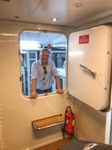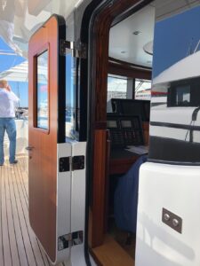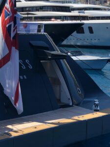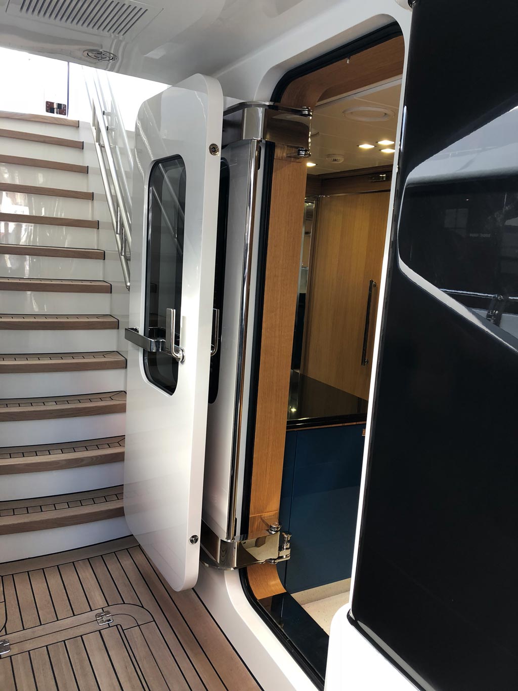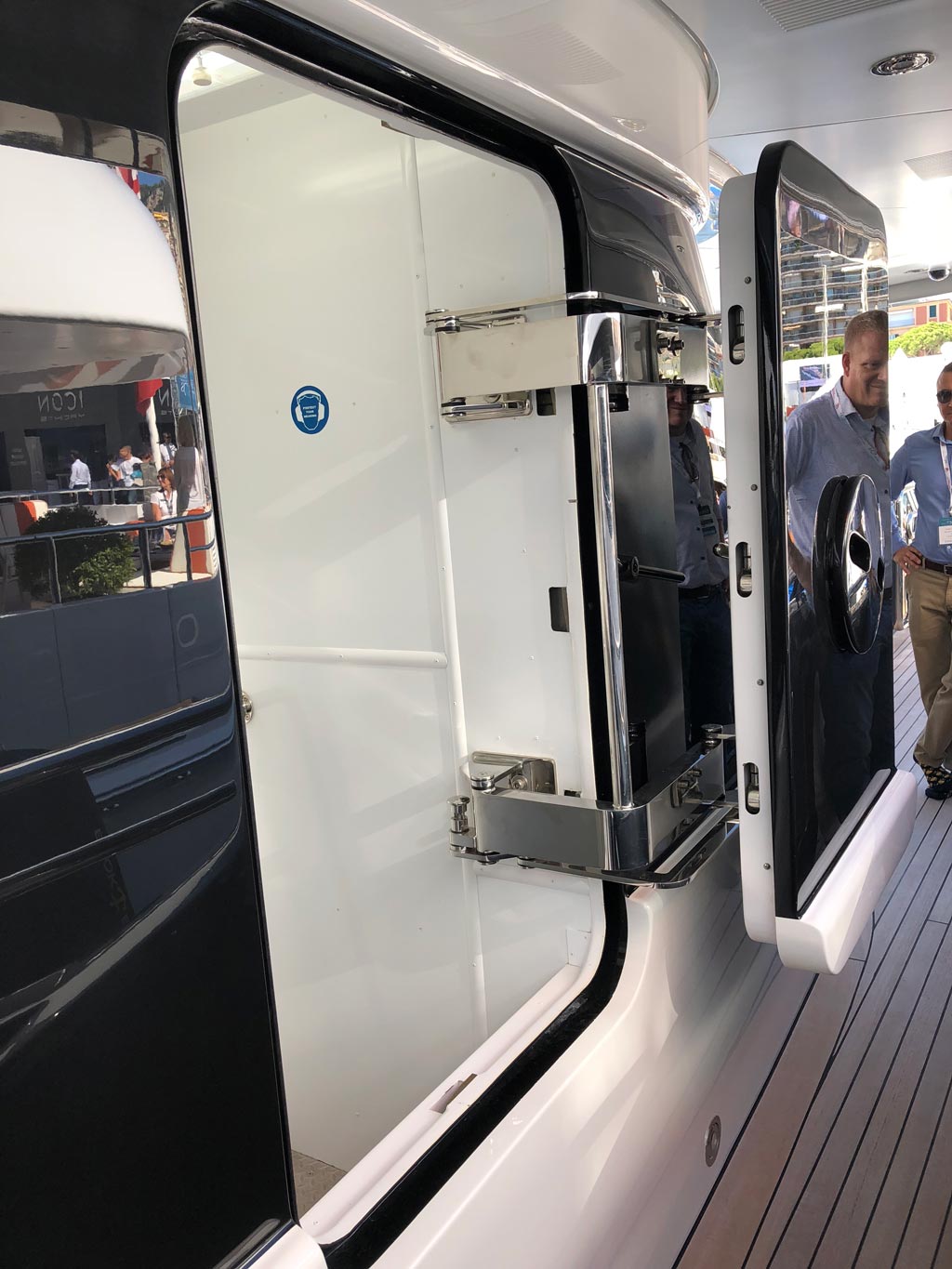 Johan Troelstra is pointing at two yachts [picture above] “In the front you can see our Transom door standing open at the stern of the 88.5-metre long superyacht ‘Barbara’ by Oceanco. In the back you can spot the fresh delivered 77-metre superyacht ‘GO’ from Turquoise yachts which Newthex provided with a total of 7 custom shell doors, 2 MOB hatches and 1 special flush pop-up sliding hatch. Newthex also delivered 10 watertight hinged doors for the ‘GO’.” he says.